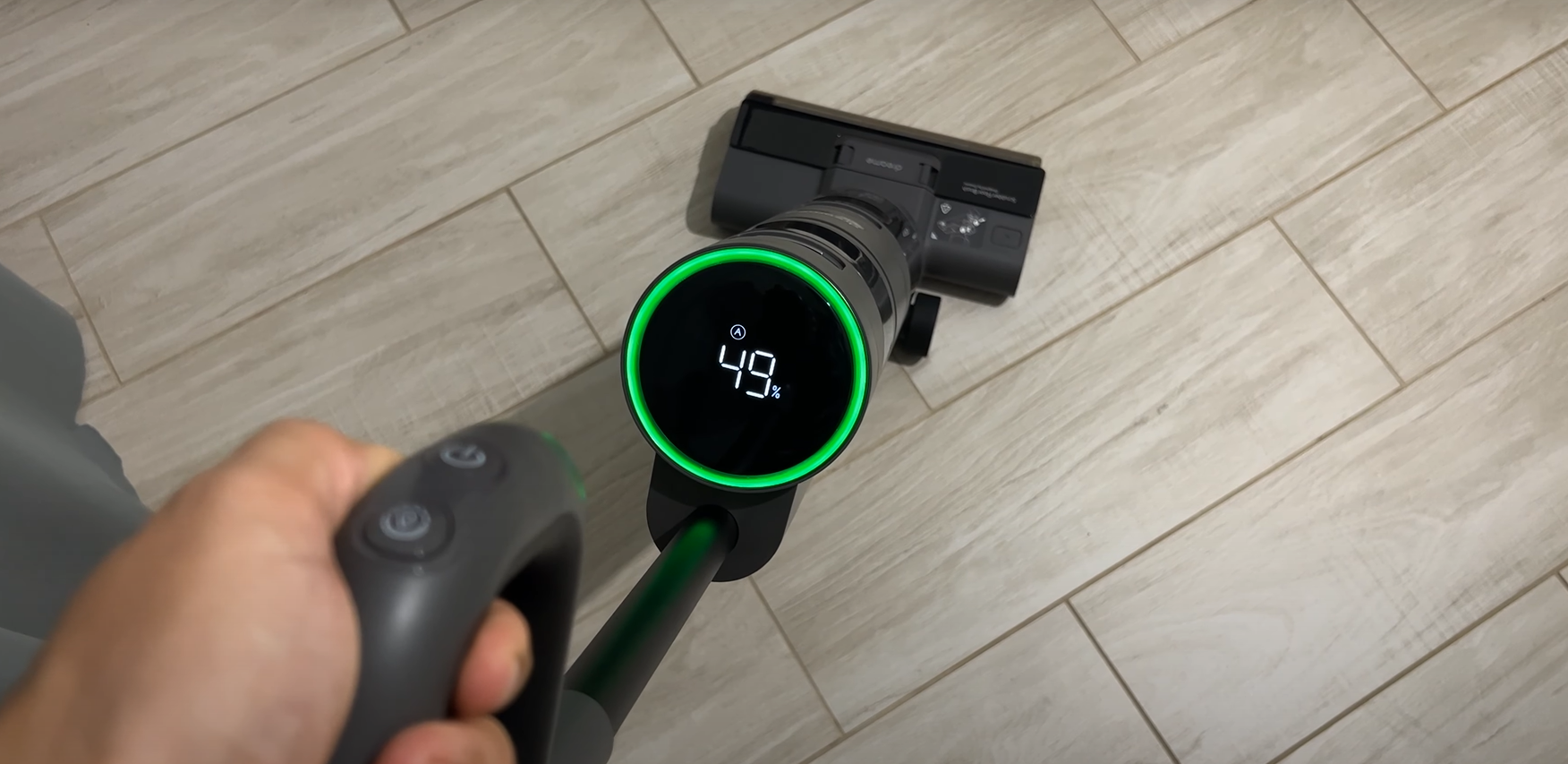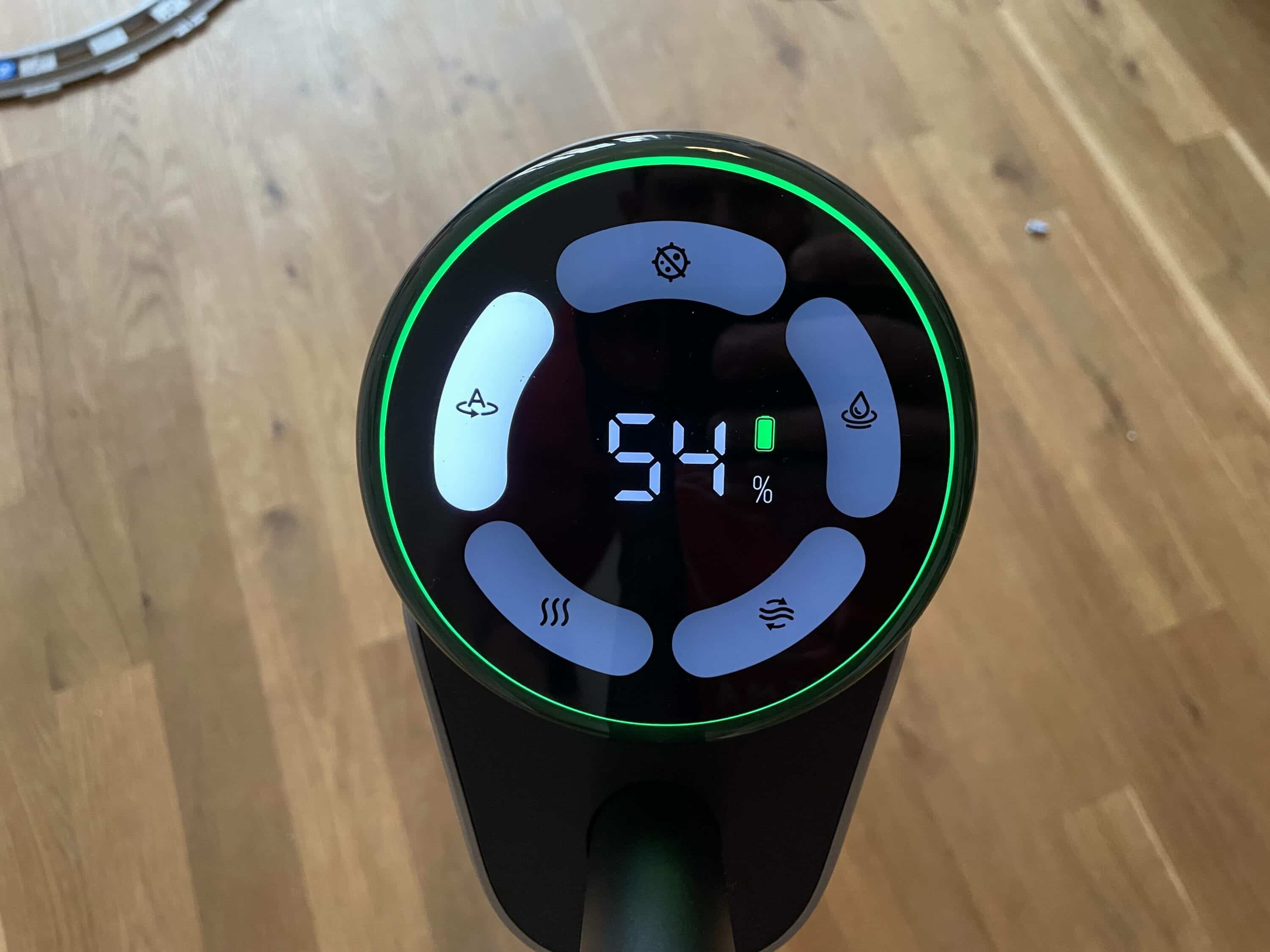 Круглый дисплей расположен в верхней части ручки, и на нём можно увидеть основную информацию по уборке и состоянию прибора: