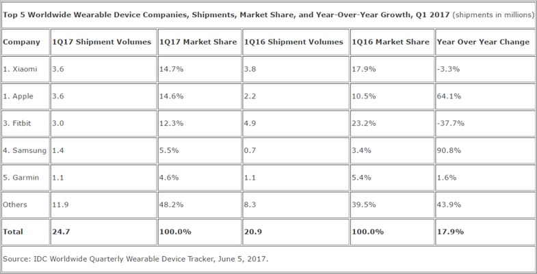 Xiaomi заняла первое место на рынке производителей носимой электроники, по данным исследовательской компании IDC. В первом квартале 2017 компания заняла 14.7% рынка, обогнав на одну десятую процента Apple. Всего несколько месяцев назад Xiaomi смогла обогнать своего второго главного конкурента - Fitbit. Несмотря на то, что компания вышла на первое место, в процентном отношении Xiaomi потеряла 3.2% по сравнению с первым кварталом прошлого года, однако общее перераспределение рыночной доли позволило компании занять лидирующую позицию, главным образом благодаря уменьшению присутствия FitBit.