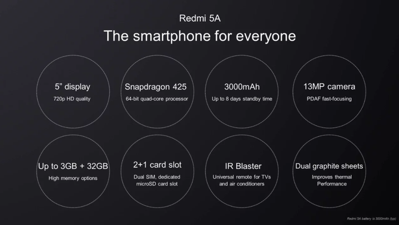 Redmi 5A оснащен 5-дюймовым HD дисплеем с разрешением 720 x 1280 пикселей. Также телефон имеет чипсет Snapdragon 425 (4 ядра, тактовая частота 1,4 ГГц). Учитывая теплые погодные условия в Индии, внутри Redmi 5A расположены двойные пиролитические графитовые листы, которые могут снизить температуру смартфона как минимум на 1 градус Цельсия.