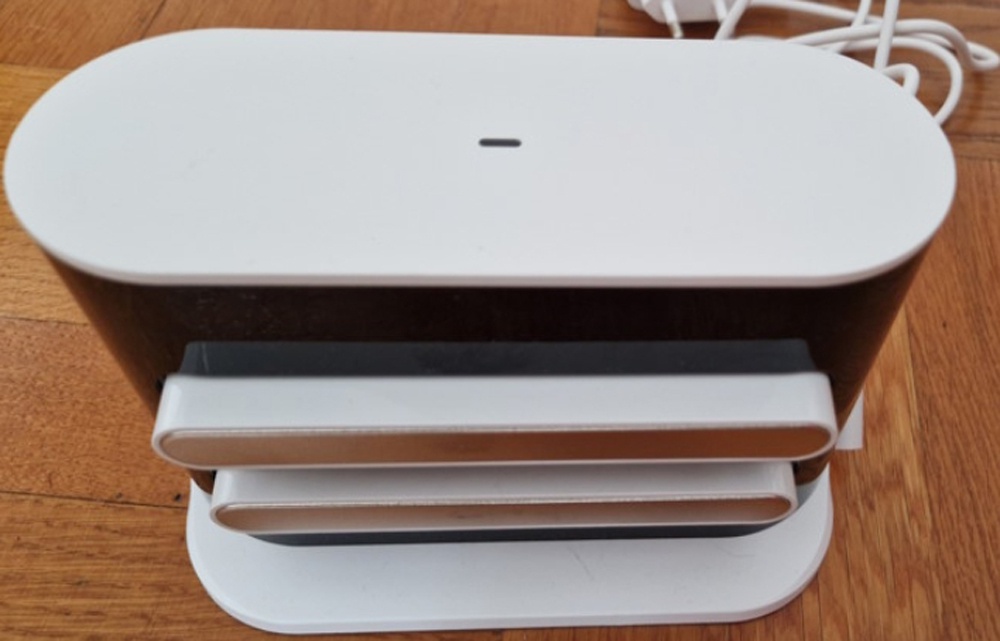 У Robot Vacuum S10 оригинальная док-станция с двумя магнитными контактами. Источник: digitalcitizen.lifeУ S10 зарядная станция ещё компактнее. У неё нет маленькой площадки с контактами для подключения пылесоса, как в модели E10. Вместо них на корпусе станции есть два выступающих элемента, к которым устройство магнитится при зарядке. Пылесос паркуется не передней частью, а подъезжает задним ходом. Прорезиненные ножки исключают скольжение и позволяют удерживать док-станцию на месте.